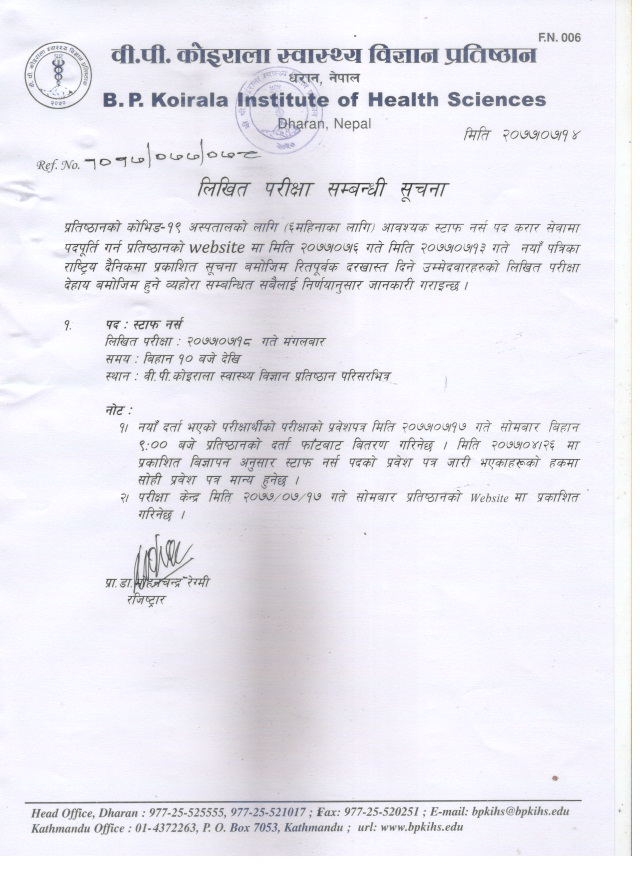 Notice for Staff Nurse Written Exam