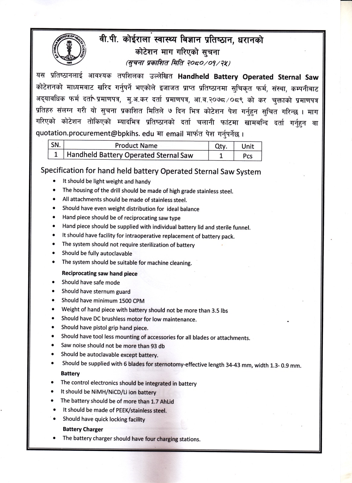 Quotation for Handheld Battery Operated Sternal Saw procurement Uploaded May 08, 2023 Size 344.01 KB Download